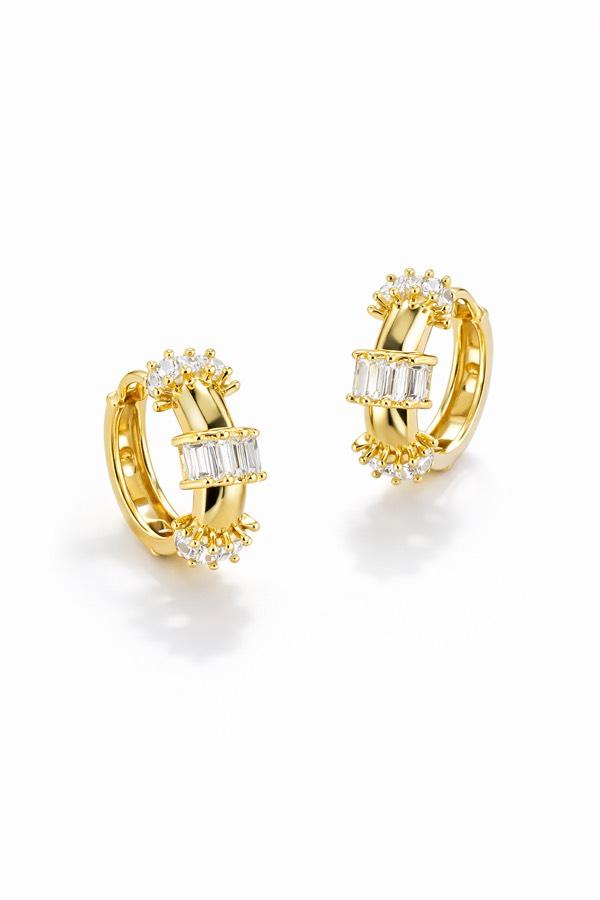 Baget kesim taşların şıklığını, yuvarlak zirkon taşlarla tamamlayan bu özel tasarım halka küpe; hem klasik hem de modern stilin mükemmel birleşimini sunar.