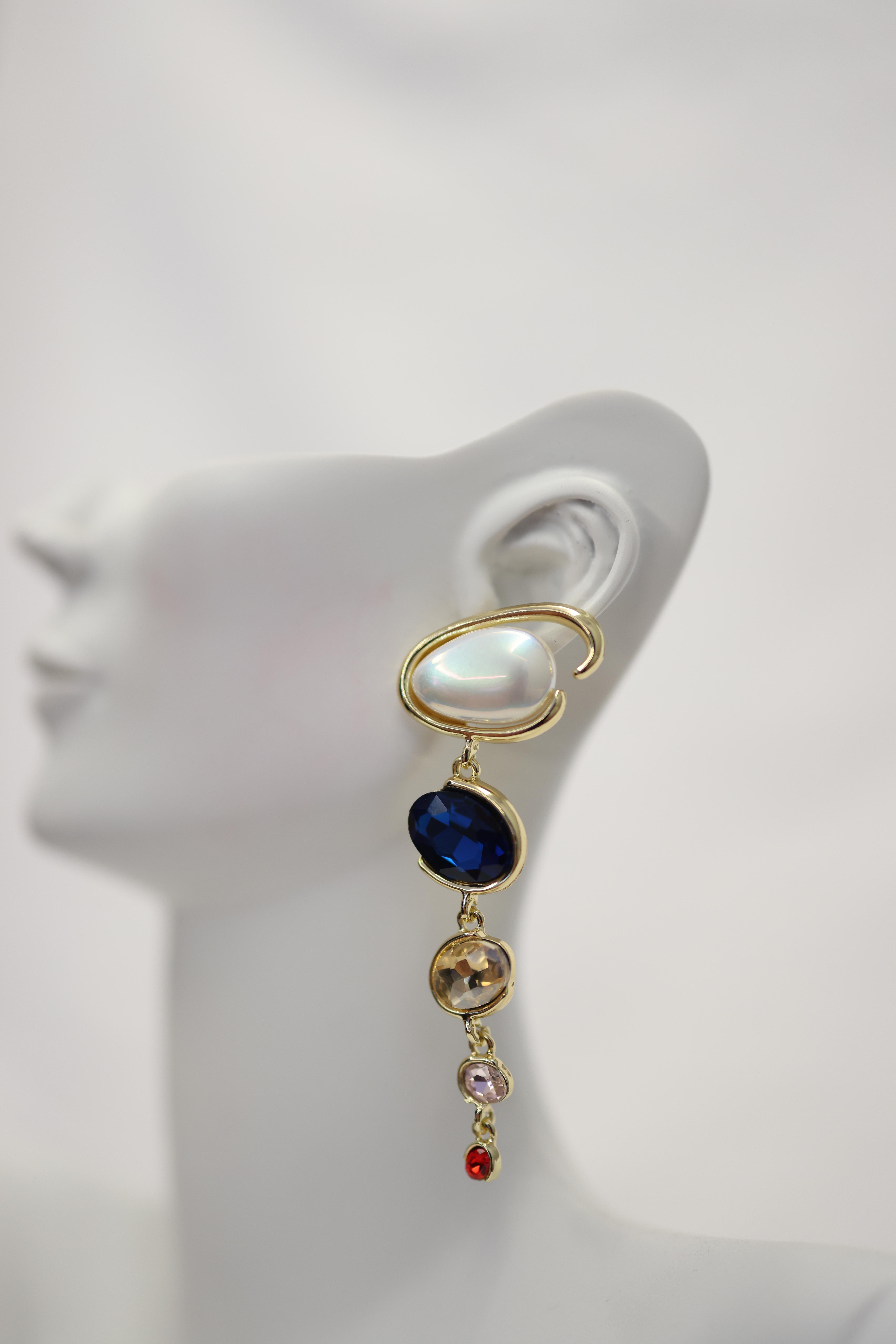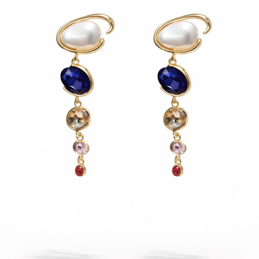 Beyaz Mavi / Şampanya Kristalleri ve İncilerle Süslenmiş Küpeler