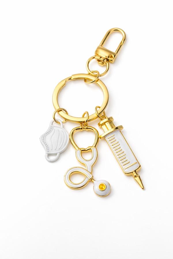 Maske, stetoskop ve enjektör detaylarıyla tasarlanan bu özel anahtarlık; sağlık çalışanlarının emeğini sade ve şık bir şekilde yansıtır.