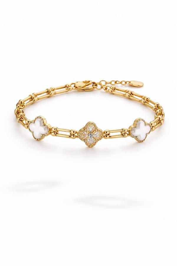 Altın ton zincir form üzerine yerleştirilen çiçek motifleri, tasarıma romantik ve sofistike bir hava katıyor. Ortadaki taş detaylı çiçek figürü ışıltıyı artırırken, yanlardaki sedef görünümlü motifler bilekliğe zarif bir denge kazandırıyor.