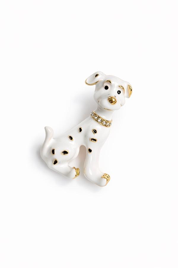 Dalmaçyalı köpek figüründen ilham alan bu özel tasarım broş, gold detayları ve zarif taşlı tasmasıyla dikkat çekici bir görünüm sunar.