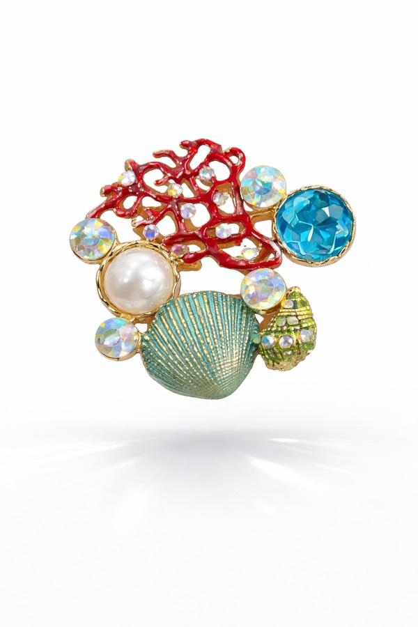 Denizin büyüleyici dünyasından ilham alan bu özel tasarım, mercan formu, inci ve deniz kabuğu detaylarıyla göz kamaştırıyor. Renkli taşları ve ışıltılı yapısıyla stiline farklı ve özgün bir hava katar.