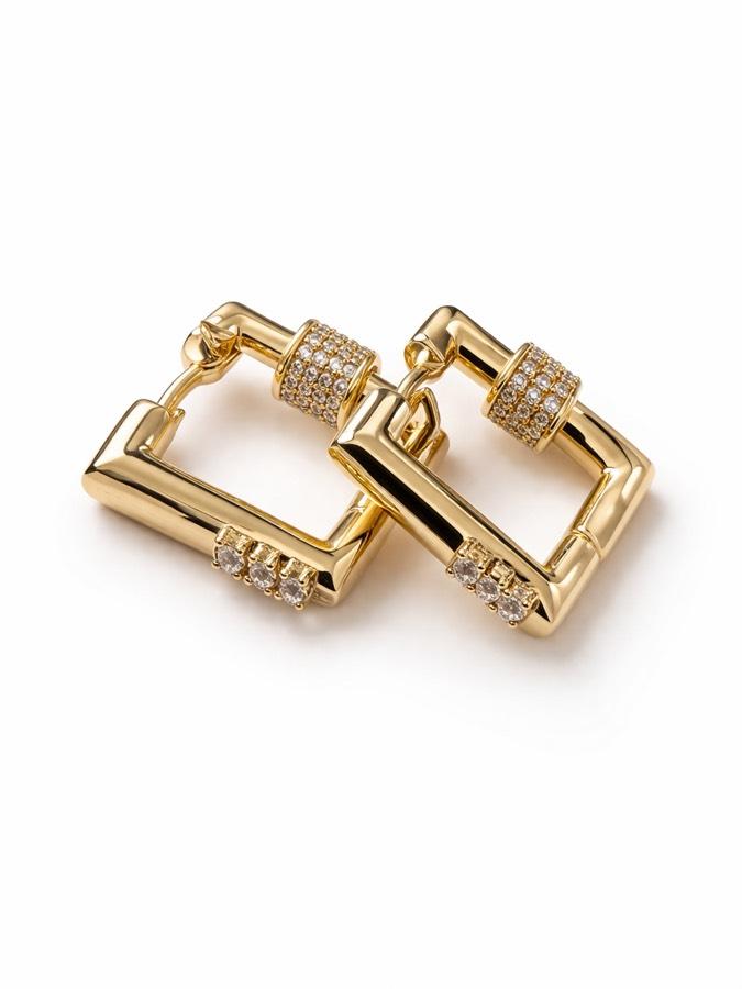 Keskin hatların zarafetiyle tasarlanan bu kare form küpeler, gold tonun sıcaklığı ve taş detaylarının ışıltısıyla göz kamaştırır. Güçlü ve modern bir stilin vazgeçilmez tamamlayıcısıdır.
