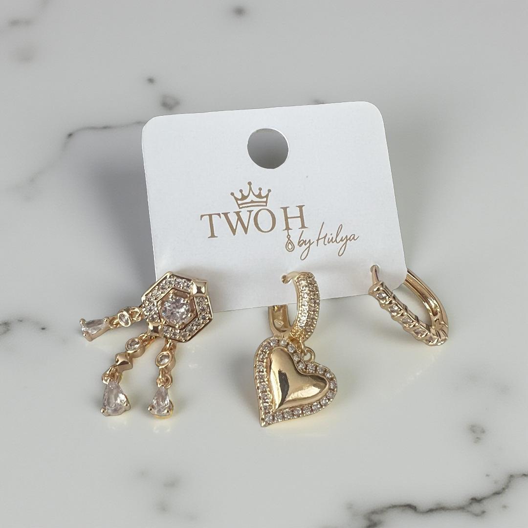 Gold Renk Taş Detaylı Üçlü Küpe