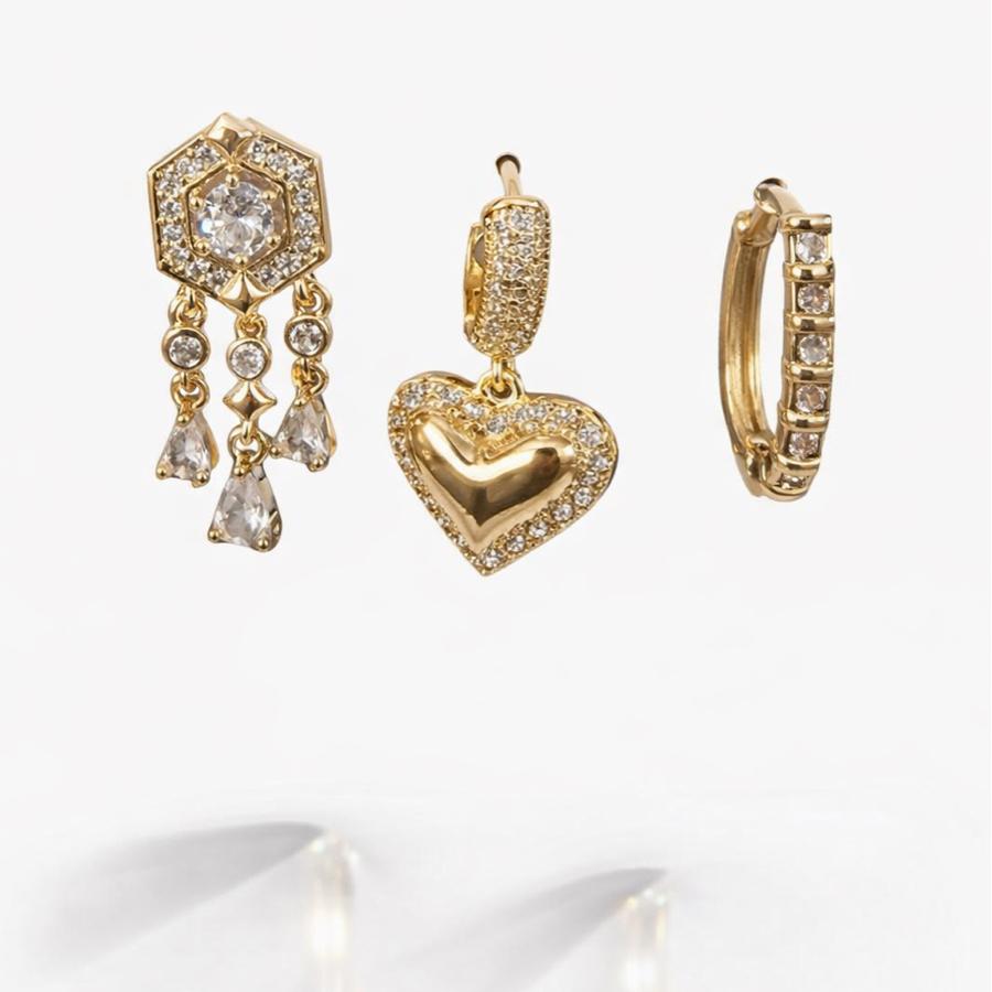 Bu özel küpe, yüksek kaliteli metalden üretilmiştir. Gold renk kaplama, zarafeti ve ihtişamı bir arada sunarak her ortamda göz alıcı bir görünüm sağlar. Küpenin üzerinde yer alan taş detayları dikkatlice yerleştirilmiş olup, ışık altında pırıltılı bir etki yaratır. Farklı boyutlardaki üç parçalı tasarım, klasik ve modern stilleri mükemmel bir şekilde harmanlayarak her tarzdan kadına hitap eder.