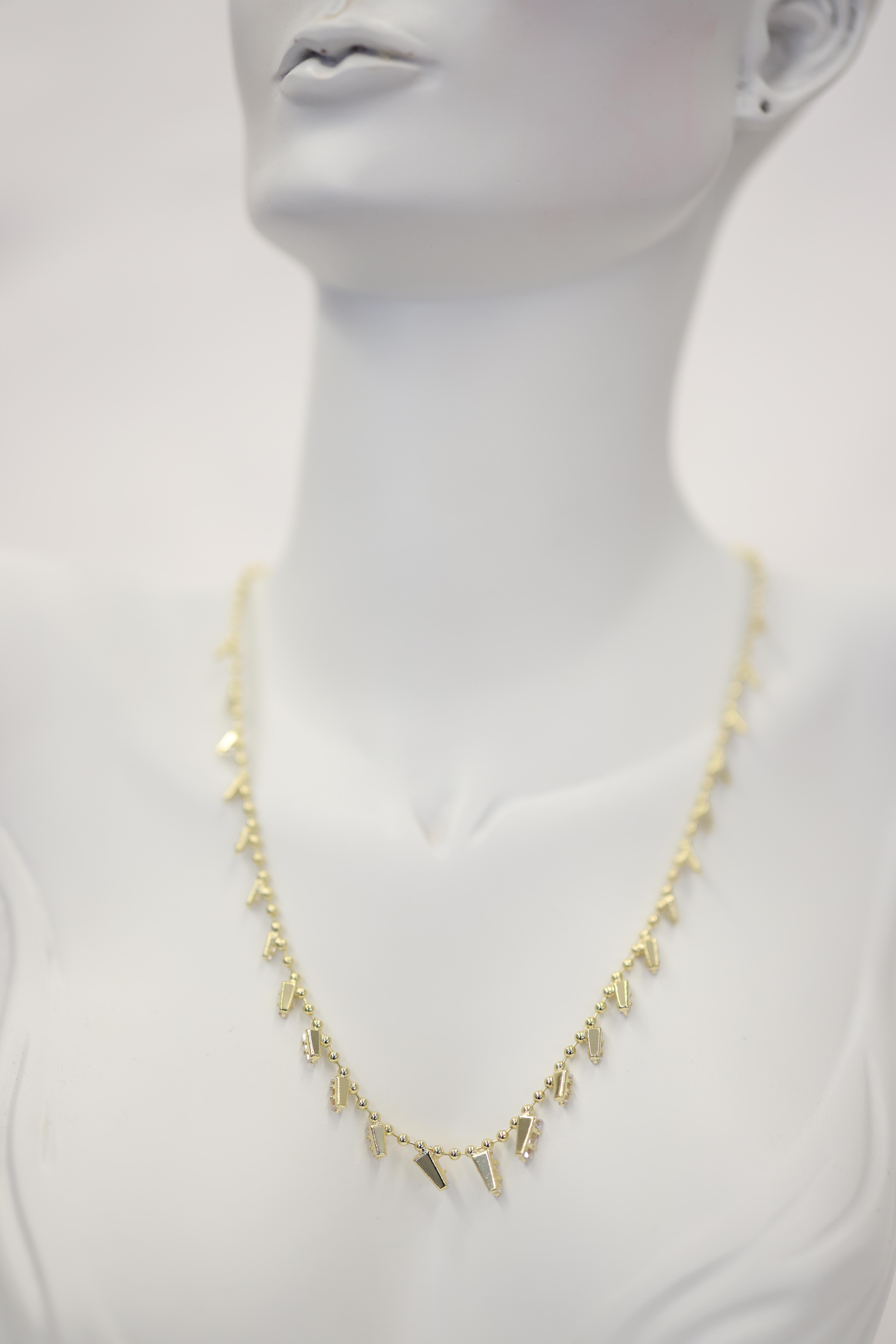 Kolyenin dikkat çeken özelliği, üst kısmında yer alan sallantılı taşlardır. Bu taşlar, farklı açılardan vurulan ışıkla birlikte parlayarak, giyenin boyun dekoltesini zarif bir şekilde vurgular. Üstün işçilikle yerleştirilmiş bu taşlar, her ortamda dikkat çekmenizi sağlayacak.