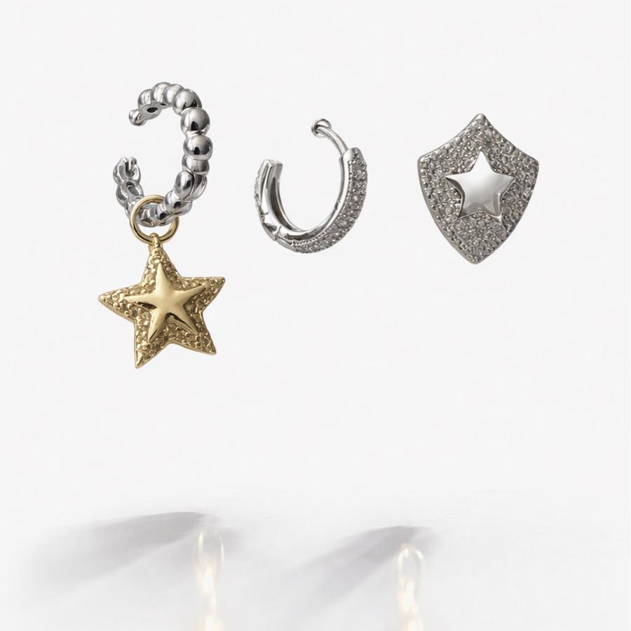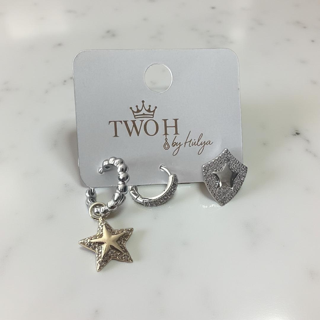 Bu üçlü küpe, modern tasarım anlayışı ile klasik detayların mükemmel kombinasyonunu simgeler. Her bir parça, birbirini tamamlayan zarif taş detaylarıyla süslenmiştir. Gümüş rengin şıklığı, taşların parlaklığı ile birleşerek, her ortamda göz alıcı bir görünüm elde etmenizi sağlar.