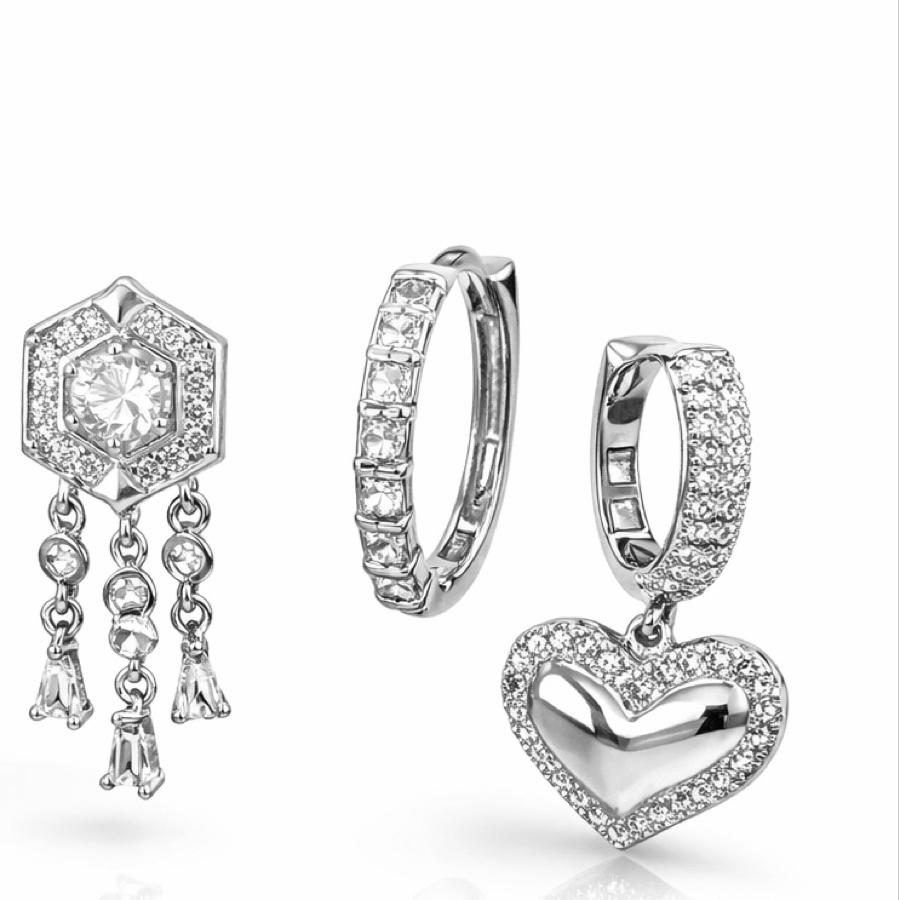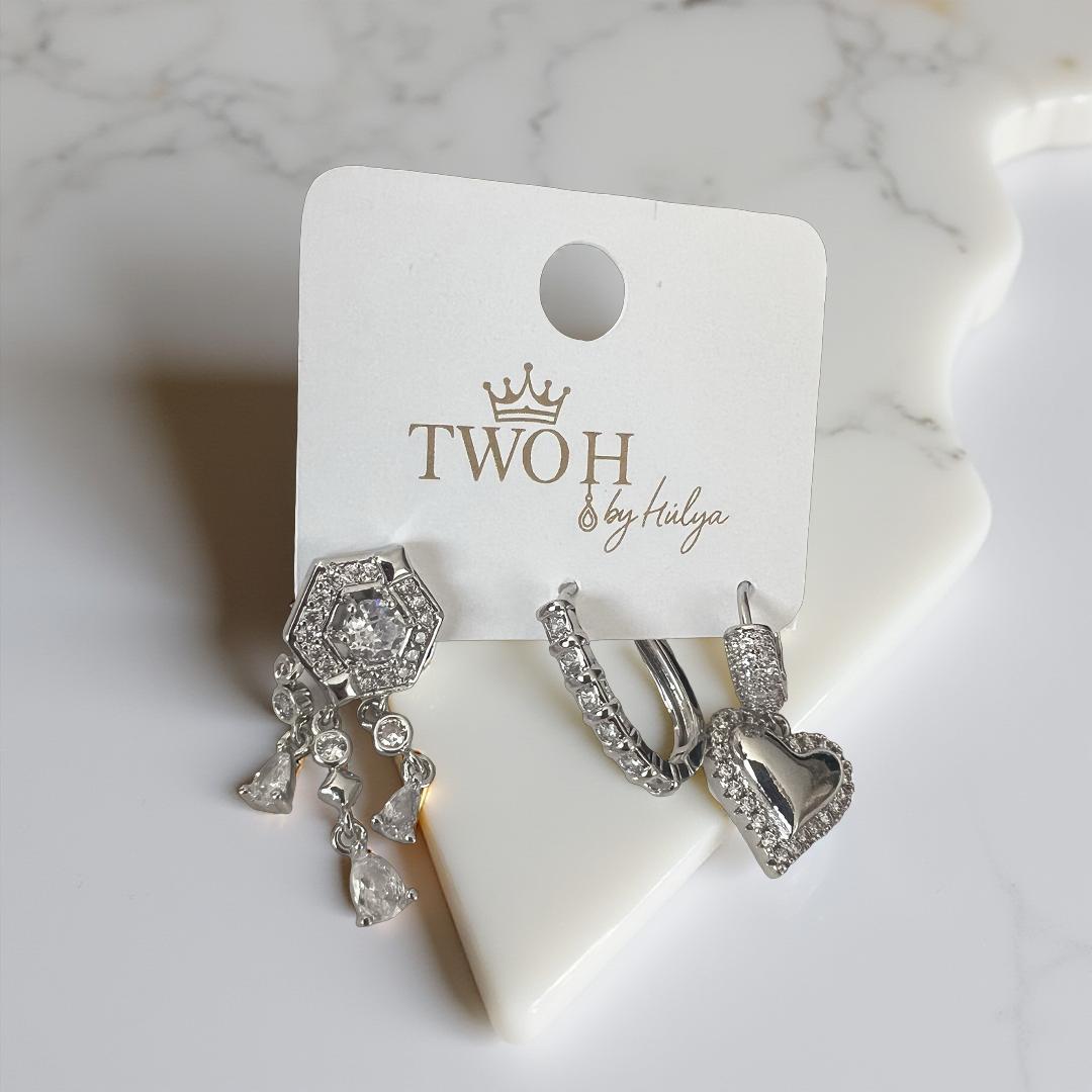 Gümüş Renk Taş Detaylı Üçlü Küpe