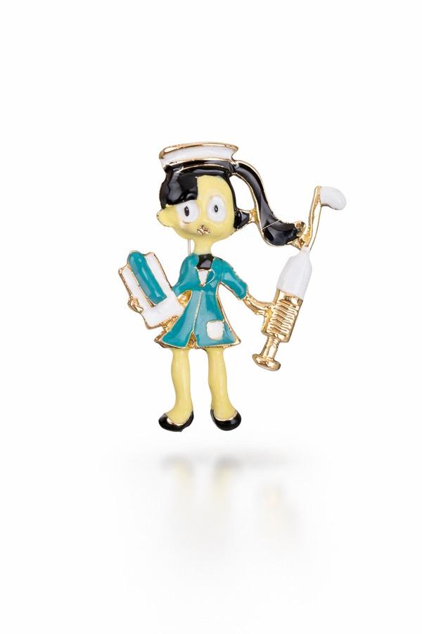 Sağlık çalışanlarının özverisini ve zarafetini yansıtan hemşire figürlü özel tasarım broş.