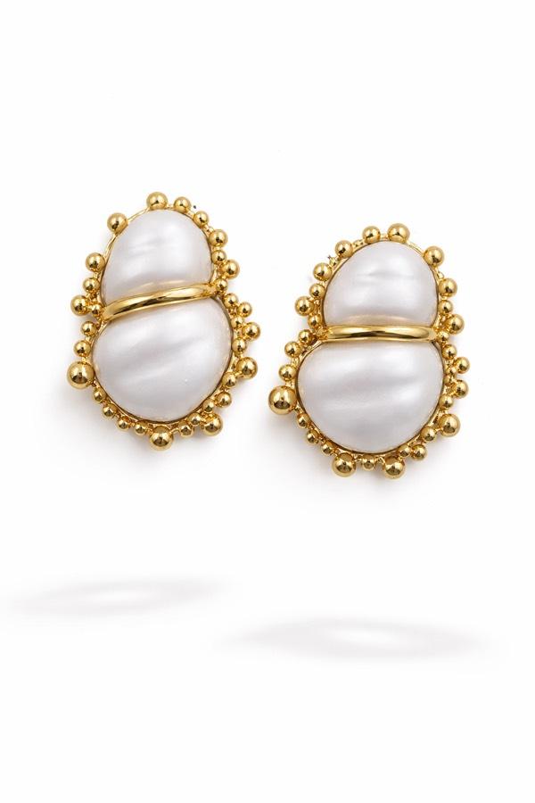 Sedef görünümlü oval form, etrafını saran altın ton boncuk detaylarla birleşerek sofistike bir duruş sunar. Ortadan geçen zarif altın şerit tasarıma modern ve güçlü bir karakter kazandırır.
