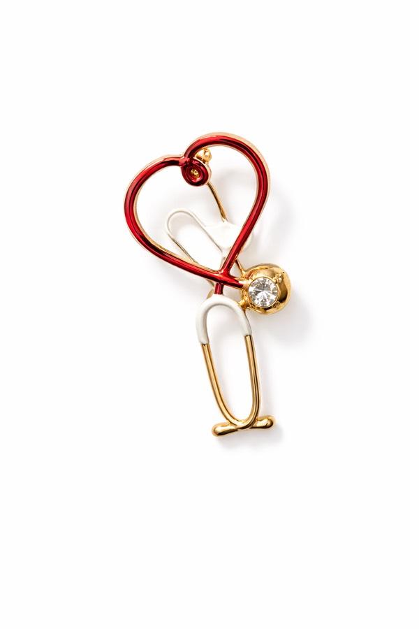 Kalp formunda tasarlanmış stetoskop detayıyla bu özel broş, sağlık çalışanlarının anlamlı ve zarif bir sembolüdür.