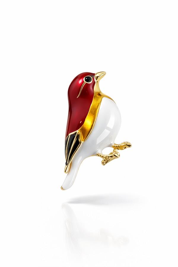 Doğadan ilham alan bu özel tasarım kuş broş, kırmızının enerjisi ve altının asaletini bir araya getirerek stilinize canlı bir dokunuş katıyor.