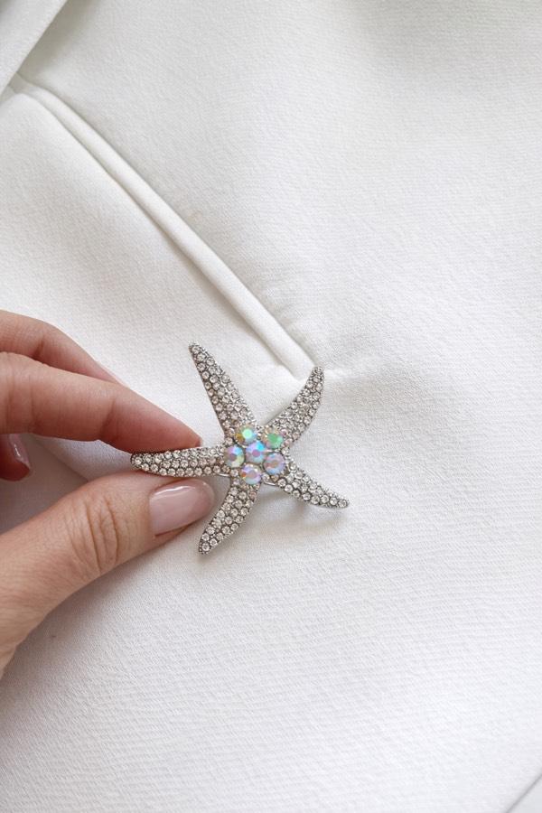 Ocean Glow Yıldız Broş, deniz yıldızından ilham alan formu ve tamamı taş kaplı yüzeyiyle göz alıcı bir zarafet sunar. Merkezindeki çok renkli ışıltı taş detayı, ışığı her açıdan yakalayarak büyüleyici bir parıltı oluşturur.