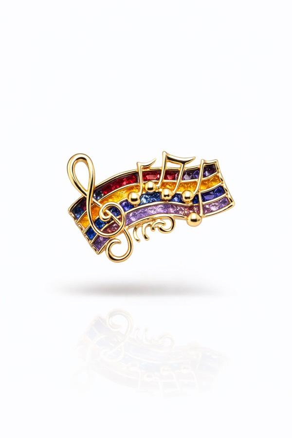 Müziğin enerjisini stiline taşı! Renkli detaylarla zenginleştirilmiş notalı tasarımıyla bu broş, kombinlerine canlılık ve özgünlük katar. Altın tonunun ışıltısı ve gökkuşağını andıran renk geçişleriyle dikkat çeken bu parça, özellikle müzik tutkunları için vazgeçilmez bir aksesuar.