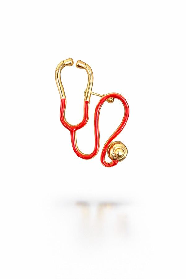 Sağlık mesleğinin simgesi olan stetoskop tasarımlı bu zarif broş, sade ve dikkat çekici tasarımıyla öne çıkar. Kırmızı mine detayları ve altın tonlu metal yapısı sayesinde hem şık hem de anlamlı bir aksesuar olarak kullanılabilir.