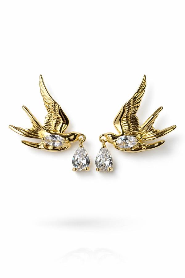 Altın tonlu kuş figürü ve sallantılı damla taş detayıyla tasarlanan bu özel küpe, stiline romantik ve göz alıcı bir dokunuş katar.