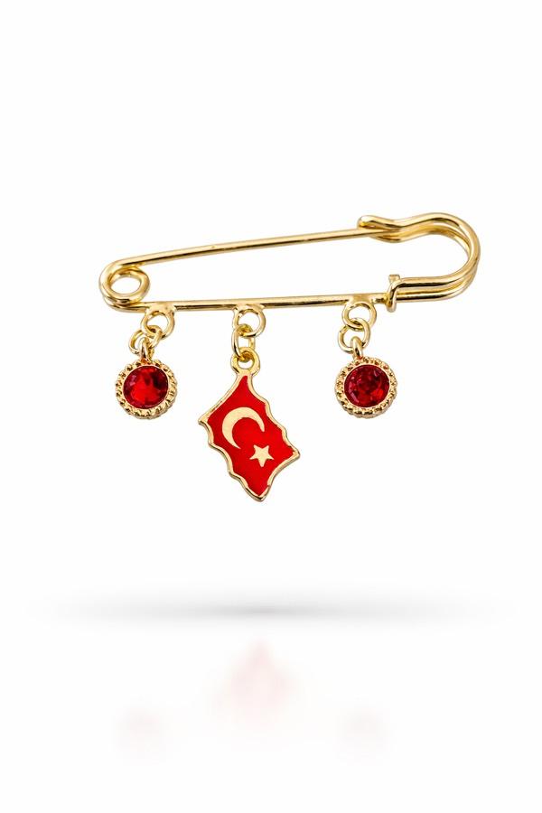Şıklık ve anlamı bir araya getiren bu özel tasarım Türk bayraklı iğne broş, zarif detaylarıyla her stile güçlü bir dokunuş katar. Altın tonlu iğne tasarımına eklenen kırmızı taşlar ve bayrak detayı, ürüne hem şık hem de anlamlı bir görünüm kazandırır.