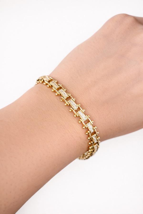 Altın ton detayları ve ışıltılı taşlarıyla tasarlanan bu özel bileklik, minimal ama dikkat çekici bir stil sunar. Hem günlük kombinlerde hem özel anlarda şıklığınızı tamamlar.