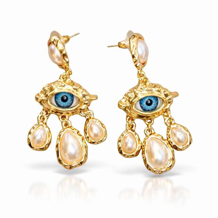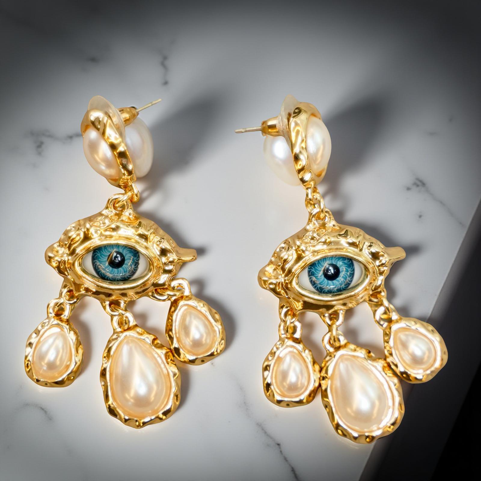 Kadın Nazar Temalı Sallantılı Gold Küpe
